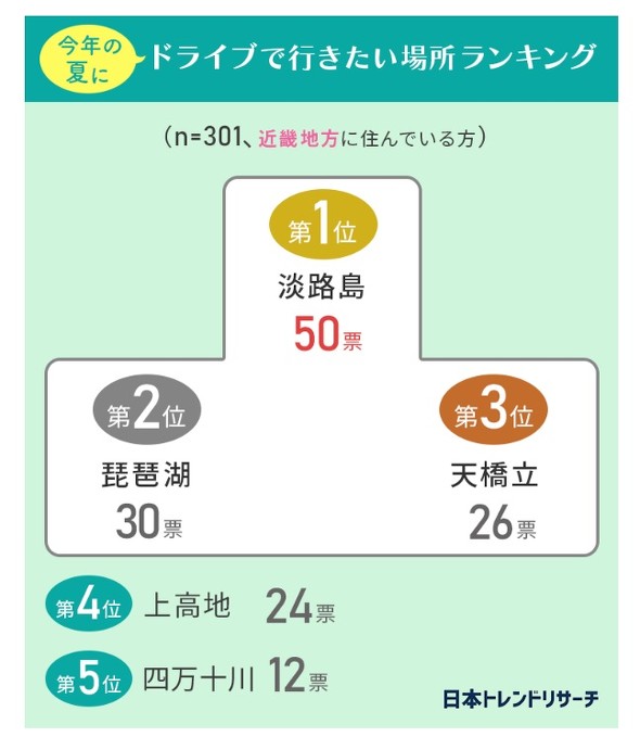 近畿地方に住んでいる人に同様の質問をしたところ、1位は「淡路島」(50票)、2位は「琵琶湖」(30票)、3位は「天橋立」(26票)だった。
