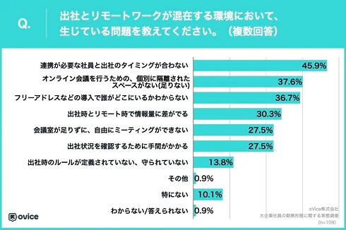 出社とリモートワークが混在する環境で生じている問題を聞くと、最も多かったのは「連携が必要な社員と出社のタイミングが合わない」(45.9%)。次いで「オンライン会議を行うための、個別に隔離されたスペースがない(足りない)」(37.6%)、「フリーアドレスなどの導入で誰がどこにいるか分からない」(36.7%)、「出社時とリモート時で情報量に差が出る」(30.3%)が続いた。
