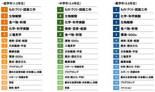 「工場見学」「プログラミング」は低学年でそれぞれ5位、11位と、他学年に比べて順位が高くなっており、支持を集めた。一方「環境・SDGs」「歴史・歴史文化」の分野は、学年が上がるにつれて順位を上げる結果となった。同社では「環境問題やゴミ問題、水質、気候などのテーマや、歴史に関するテーマには、生活科から理科と社会に分かれる3年生以降、関心を持って取り組む小学生が多くなっている」とした。