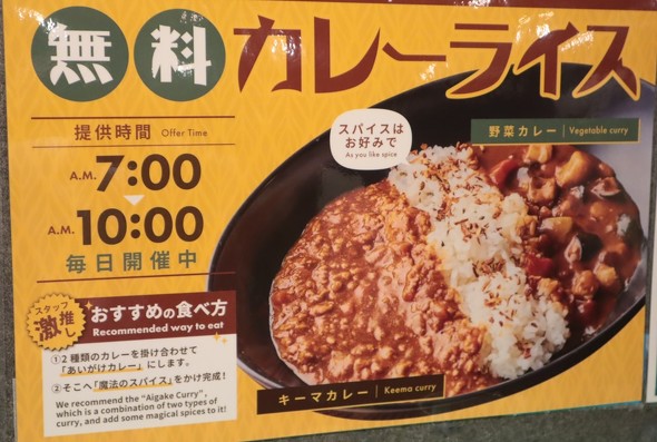 午前7〜10時には無料のカレーライスを毎日提供する。また、カレーとの相性を考え、同時間帯にはラッシー(プレーンとマンゴー味)も出す。午後9時以降には炊き込みご飯が登場。その日によって「すき焼き風」「ピラフ風」「ビビンバ風」などと使い分けているようだ(無くなり次第終了)。