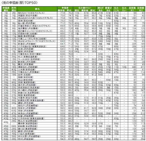 幸福度の高い街(駅)のトップはつくばエクスプレス「柏たなか」(同77.4)。以下、京成千原線「学園前」(同75.8)、つくばエクスプレス「流山おおたかの森」(同73.4)、京成本線「海神」(同73.2)、JR内房線「袖ヶ浦」(同71.2)が続いた。