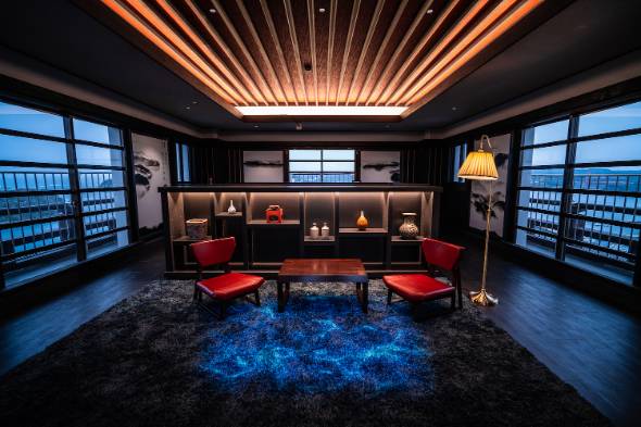かつて南蛮貿易の中心地として繁栄した歴史を踏まえ、内装のテーマは伝統とモダンを融合させた「和洋折衷」としている。
