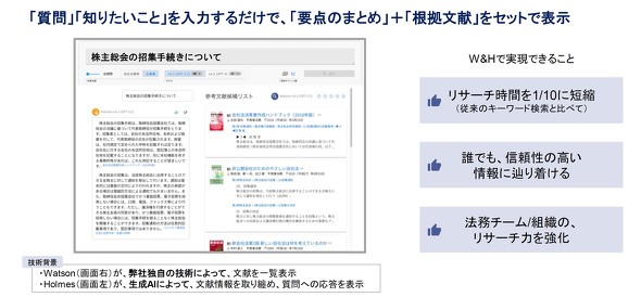 まず、Watson & Holmesではキーワードではなく文章 (自然言語)を用いて多数の文献からナレッジを引き出すことができます。さらに、入力されるべき文章は、必ずしも法務パーソンの実務経験が必要なものではありません。例えば、総務部における株主総会に関する質問や、人事部における労務に関する質問、経営企画部におけるM&Aに関する質問など、法律事務所や企業法務部の外で発生する調査にも適用が可能になっています。これにより、従来のユースケースを大幅に広げ「とりあえずWatson & Holmesで調べてみる」が実務に根付いていくものと考えています。