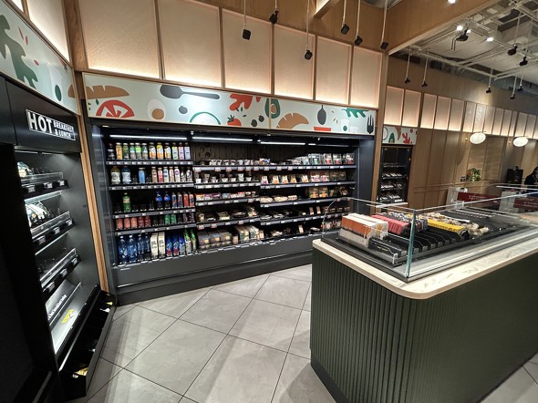 ゲートを通るとサラダやサンドイッチ、スナック類が置かれているアマゾン・ゴーのエリアが広がり、イートインスペースにはテーブルや椅子があります。飲み物はスターバックスのアプリを介して注文しながら、食べ物はジャスト・ウォークアウトを通ってレジなしです。