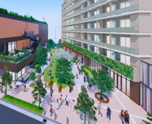 屋外には、同施設とNTT都市開発による住宅棟との間に約1000平米の「憩いの広場」を整備。2024年夏オープンを予定しており、子どもの遊び場としても利用できる地域住民の憩いの場、交流の場を提供するとしている。