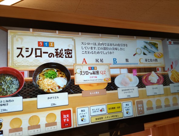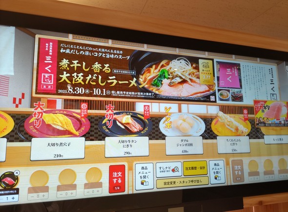 筆者がよく利用するスシロー店舗のボックス席には、注文用のタブレットが1台設置してある。他の外食チェーンでよく見かけるものとほぼ同じで、商品を選んで注文する仕組みになっている。
