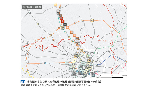 2010年代以降、分譲マンションなどの不動産市場では武蔵小杉駅(川崎市中原区)と浦和駅(さいたま市浦和区)が注目されています(図3、4)。武蔵小杉は2010年に横須賀線、湘南新宿ラインの駅ができて、都心への所要時間が10分以上短縮。浦和駅にも2012年に湘南新宿ラインが停まるようになりました。