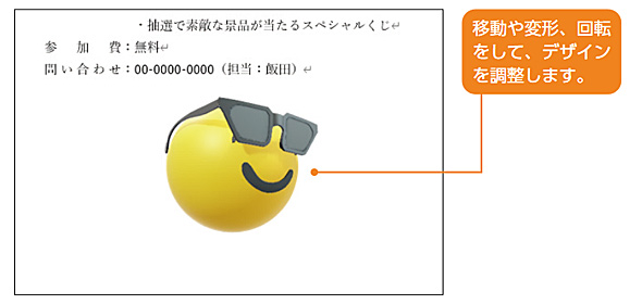 3Dモデルが挿入されます。「絵文字」をドラッグすると3Dモデルの向きを調整できます。図形と同様に、移動や変形、回転をして、デザインを調整します。
