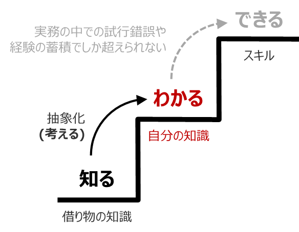 「知る」ことは読書やセミナー参加などの座学で学習可能です。しかし「分かる」ためには、自身の頭で考え、借り物の知識を自分の知識として定着させる必要があります。学ぶことは、学ぶこと(知識を増やすこと)そのものに価値があるのではなく、「考える材料」を増やすことこそに意味があります。