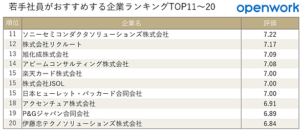 集計対象は、直近3年間の20代新卒入社者による回答。自社を「どれくらいおすすめできるか」という観点から回答するNPSスコアの高い企業ランキングは、以下の通りとなりました。