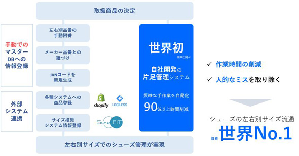 左右別の靴を扱うということは、売る側はそれぞれの商品を管理しなければいけない。例えば、右足、左足の品番をつけなければいけない。次に、メーカーの品番と紐づけて、さらにJANコードを新たに生成しなければいけない。
