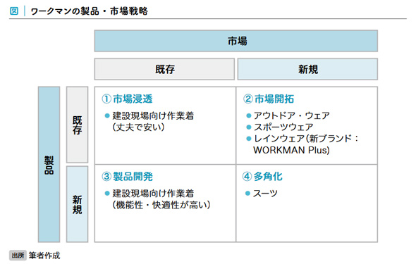 昨今では、その製品の耐久性に注目したバイク愛好者やアウトドア好きの顧客がSNSなどでワークマンの製品を紹介することで、一般顧客への認知が高まり、販売を押し上げました。また、業務服を日常着に取り入れる女性顧客が「ワークマン女子」として話題になる現象も起こりました。こうした顧客ニーズを受けて、ワークマンはアウトドアやスポーツ専門の新ブランドを立ち上げました((2)市場開拓)。