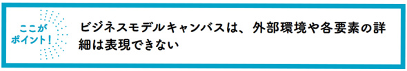 このように、ビジネスモデルキャンバスは、ビジネスモデル全体を俯瞰したり、要素同士の関係性を表現したりする場合は有効ですが、一方で、ビジネスモビジネスモデルの外部環境や各要素の詳細については表現できません。
