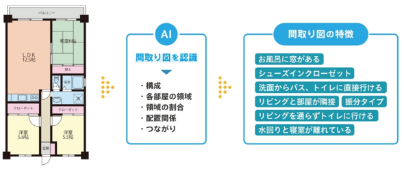 間取り図特徴抽出は、AIが間取り図画像から間取りの構成、リビング・居室・キッチン・水回り・収納などの各領域、配置関係、つながりなどを解析し、間取りの特徴として判別することが可能です。本AI技術を活用することで、物件情報の登録漏れを補填(ほてん)できます。また、間取りの特徴を可視化することで物件アピールの幅を広げられます。