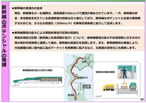 時速320キロメートル化が実現すると、札幌延伸開業時に東京〜札幌間は5分程度短縮されて、4時間半を切るかもしれない。中期経営計画2026には「新幹線札幌開業を見据えた北海道新幹線のさらなる速達化の検討」とも記載されている。これはJR東日本が次世代「はやぶさ」向けに開発している試作車両「ALFA-X」で時速360キロメートル運転を目指していることに連動する。「ALFA-X」は走行試験で時速400キロメートルの安定走行を達成している。課題はもう車両ではなく、防音設備にある。