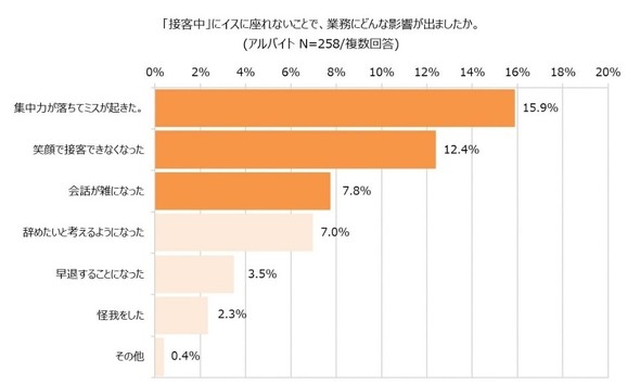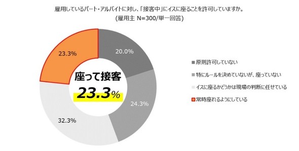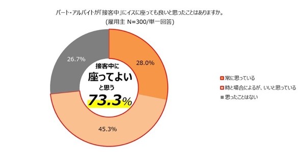 同社の「パート・アルバイトの接客中の立ち仕事に関する調査」によると、座り接客が許されているアルバイトは23.3%。椅子に座れないことで「集中力が落ちてミスが起きた」「笑顔で接客できなくなった」といった声も聴かれます。また、19.7%の企業が、立ち仕事による肉体的な要因でアルバイトが退職した経験があるとのことです。