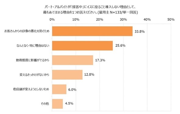 座って接客をしても良いと思っている企業は73.3%もいます。では、なぜ許可しないのでしょうか。理由の1位は「お客さんからの印象の悪化を防ぐ」(33.8%)、次に多いのが「なんとなく・特に理由はない」(25.6%)です。明確な理由がないままに、アルバイトが立ちっぱなしになっていることが分かりました。これが日本の小売業の実態です。