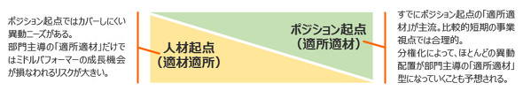 事業戦略と人事戦略との連動が強調される中、各部門主導によるポジション起点の人事が増えていくことが想定される。ジョブ型という観点ではポジション起点の適所適材異動は合理的であり、当然の方向性だ。ただ、現在すでに人材起点の異動とポジション起点の異動は半々であり、この流れのまま進むとほとんど全ての異動がポジション起点のものになるかもしれない。問題は、ポジション起点の異動ばかりでよいのかという点だ。