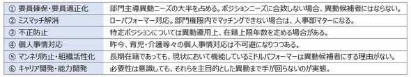 さらに、業績向上のために「(5)マンネリ防止・組織活性化」の異動も行いたいとの各部門ニーズもある。従業員が期待する計画的な「(6)キャリア開発・能力開発」のための異動については、その重要性は重々承知していても、実態としてはなかなかそこまで手が回らないという企業も多いことだろう。