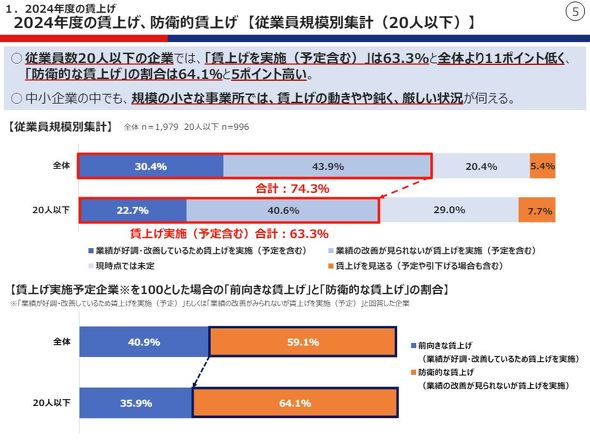 しかし労働組合からいくら賃上げを要求されても、ない袖は振れない中小企業も少なくない。日本商工会議所・東京商工会議所の「中小企業の賃金改定に関する調査」集計結果(2024年6月5日)によると、2024年に「賃上げを実施(予定含む)」と回答した企業は74.3%。従業員数20人以下の企業では63.3%と全体より11ポイント低かった。「現時点では未定」ないし「賃上げを見送る」企業が30%前後も存在する。