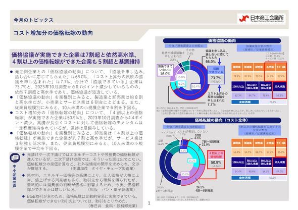 ではその効果はどうか。日本商工会議所の「商工会議所LOBO(早期景気観測)」(4月30日)によると、発注側企業との「価格協議の動向」について、「協議を申し込み、話し合いに応じてもらえた」企業は66.0%。「コスト上昇分の反映の協議を申し込まれた」7.7%で、「協議ができている」企業は計73.7%だった。