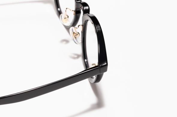 1日中快適に使えるよう、軽量樹脂素材を使用。リムの裏面の内側を薄くすることでレンズの厚みの目立ちにくさを保ったまま、フレームを軽量化している。テンプルは頭を抱え込むように角度を調整し、フィット感を高めた。