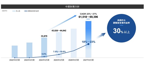 調整後営業利益については、売上高成長に必要な投資を行いながらも、これまで以上のスピードで成長させる方針を示した。2027年5月期における調整後営業利益率は18〜23%を目指すとしており、金額でいえば110億〜159億円規模となる。