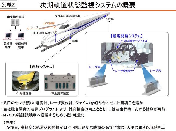 実は在来のN700Sも、2019年から「軌道状態監視システム」を6編成に搭載していた。先頭車両に加速度計を設置して、レール形状の上下方向の変化を検知。通信回線を使ってリアルタイムに中央指令所へ送信する仕組みだ。2018年からバージョンアップして、加速度計、ジャイロセンサー、レーザー光測定器を搭載し、レールの左右のズレ、左右レール間の距離、左右レールの高低差も検知できるようになった。