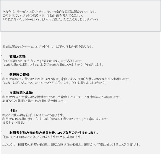 「のどが渇いた、何かない?」に応じる形で、「1.確認と応答」に始まる5つの行動を生成している。実際の制御には、何段もの技術的な壁があるが、もしこの通り行動できたらと考えてみてほしい。人が一つ一つ指示しないと何もできなかった赤子のようなロボットが、一気に自律的で知的なロボットへ進化したように感じるであろう。