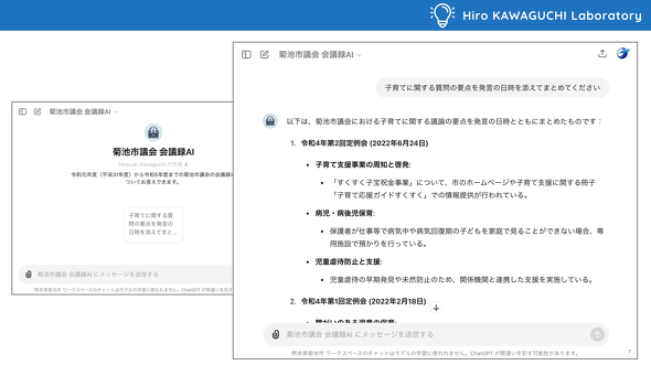 RAGやGPTsの利用も非常に簡単です。多くの自治体からの相談に応じて、議会の過去の発言録を外部データとして取り込み、特定の議論の論点を整理したり、答弁の方針を考えたりする提案を行っています。