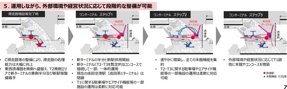 成田空港の航空機の年間発着回数は、2024年度が25万回で、2040年代後半には50万回に達するという。旅客ターミナル容量は、現在年5700万人だが、年50万回発着時は7500万人になる。増強に対し、発着回数は滑走路の延伸と新設を進め、ターミナル容量については「ワンターミナル構想」が浮上した。