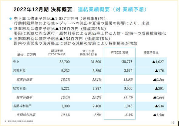 2022年に注目すべきは、売上高が伸びた一方で営業利益率が下がり始めた点です。前年の決算説明資料では、2022年の営業利益率は前年比1.1ポイント増と予想していたにもかかわらず、実際は2022年8月に発表した修正予想よりも下回る結果となりました。急激な円安進行・原材料高による原価率上昇や、積極的な店舗展開などによる設備投資の増加が要因と考えられます。