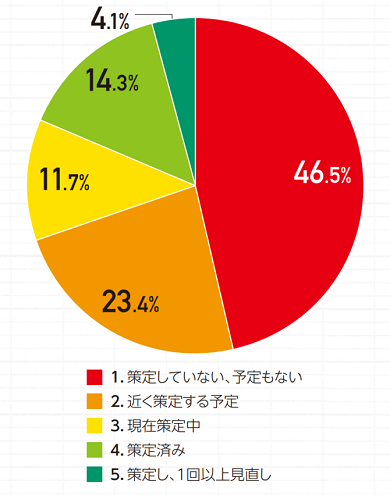 企業はどうか? 危機管理とBCPの専門メディア「リスク対策.com」が2023年10月に企業向けに実施した南海トラフ地震臨時情報に対するアンケートでは、44.2%が臨時情報について「ある程度理解している」、17.3%が「具体的に内容を説明できる」と回答した(グラフ1)。市民に比べると、理解度は高いものの、具体的な対応計画については「策定しない、予定もない」との回答が46.5%と半数近くを占めた(グラフ2)。