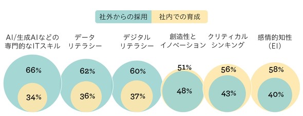 AI・生成AIやデータ活用などを得意とする高度IT人材が社内で不足した場合、どのように補うかを調査したところ、34.0%が「社内で育成する」、66.0%が「社外から採用する」と回答した。