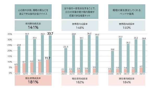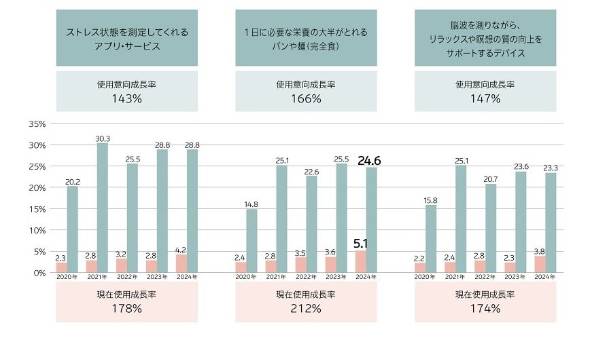 心拍数や歩数、睡眠の質などを測定できる腕時計型デバイスは、2020年の調査と比べると、使用意向の成長率は141%、現在使用の成長率は181%となった。「1日に必要な栄養の大半が取れるパンや麺(完全食)」(同24.6%、同5.1%)も、同じく伸長傾向にある。