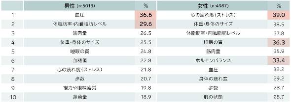 男性の1位は「血圧」(36.6%)、2位は「体脂肪率・内臓脂肪レベル」(29.6%)、3位は「筋肉量」(26.5%)となった。健康診断で指摘されやすい項目に高い関心が見られる。