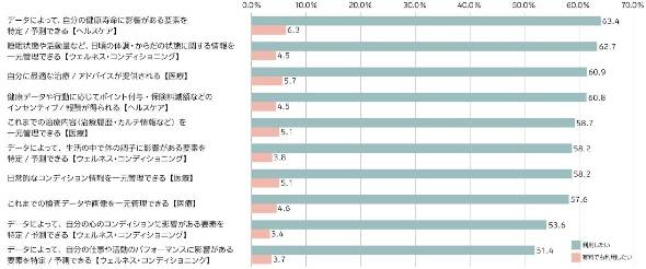 ヘルスケアデータを活用したサービスの利用意向については、全体の半数以上の人が「利用したい」と回答。一方「有料でも利用したい」と回答した人は10%以下となった。利用したいと最も声が多かったのは「データによって、自分の健康寿命に影響がある要素を測定/予測できる【ヘルスケア】」(利用したい、が63.4%)となっている。