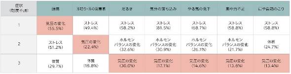日頃悩まされている「症状」について、原因は何だと思うか質問した。「頭痛」を見ると「ストレス(51.2%)」を上回り、「気圧の変化」(55.5%)が1位に。気圧の変化は、その他の全ての症状の原因として3位以内に挙がっている。