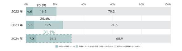 最後に、ウェルビーイングの言葉やその内容を知っているか尋ねた。「内容まで理解している」(7%)、「見聞きしたことがある程度(内容は分からない)」(24.2%)と、認知度は31.1%だった。2020年の20.8%と比べると10.3ポイント増えたものの、言葉の認知度は生活者の3割にとどまった。