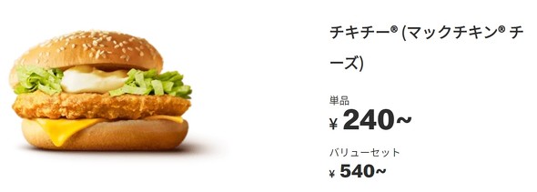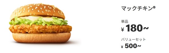 マックチキンは「チキンフィレオ」と同様にチキンパティを挟んだバーガーだが、重量は138グラム。183グラムのチキンフィレオより軽く、大きさも一回り小さい。カロリーもおよそ100キロカロリー少ない。マックチキンにポテト・ドリンクのMサイズが付いたバリューセットは500円〜であり、680円〜という設定のチキンフィレオセットより200円程度安い設定だ。“下位互換”の商品を生み出すことで、500円台の低価格需要に応えている。