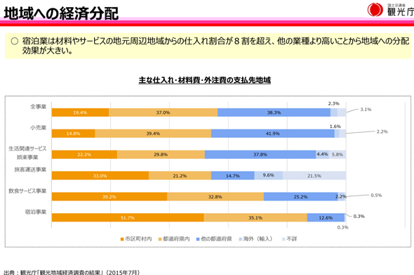 もっと言えば、「観光」は地方活性化にも重要だ。観光庁の資料によれば、宿泊業は他産業に比べて材料やサービスの地元周辺地域からの仕入れ割合が高く、8割を超えている。つまり、地産地消ではないが地域経済を回す原動力になっている。