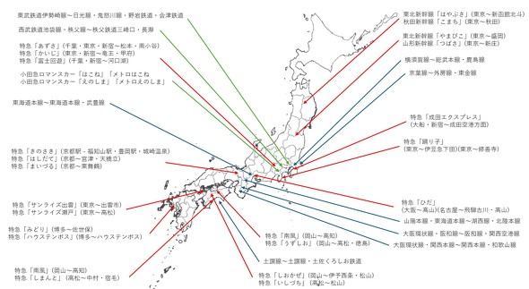 これ以上はキリがないので別図に示す。分割併合が広く行われる理由は「はやぶさ」と「こまち」とほぼ同じ。鉄道事業者にとっては効率が良く、乗客にとっても乗り換えなしという利点がある。乗り換えなしは最も魅力的なサービスの1つで、懸念や欠点を大きく上回ることがお分かりいただけるだろう。