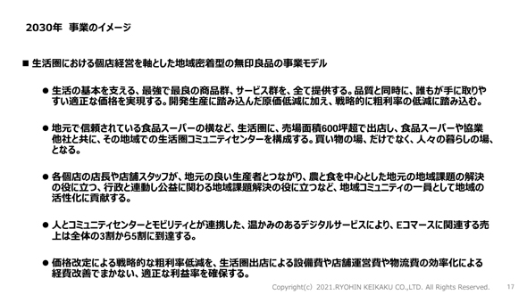 この背景には、良品計画が掲げている「個店経営」がある。画一的なチェーンストア経営ではなく、地域の課題に商品とサービスで貢献していくことをビジョンとしているのだ。