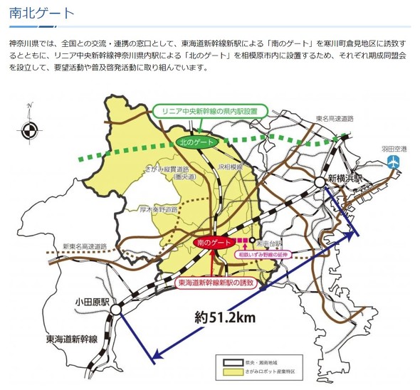 さらに神奈川県はJR相模線沿線を相模ロボット産業特区として、国の地域活性化総合特区の指定を受けた。その特区で、新幹線倉見新駅を「南のゲート」、リニア中央新幹線の神奈川県駅(橋本駅)を北のゲートと位置付けている。東海道新幹線とリニア中央新幹線にとって集客効果のある地域づくりを目指している。倉見新駅は、建設費を神奈川県や自治体が負担する「請願駅」となる。