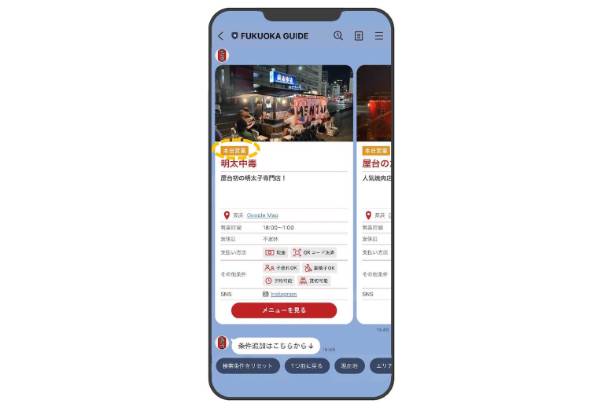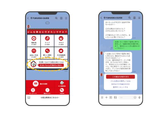 福岡市内の約100軒の屋台から、「現在地」や「グルメ」などの条件で、お好みの屋台を検索する機能を追加した。さらに生成AI(ChatGPT)を導入し、「屋台常連の“AIおいちゃん”」とのやりとりを通じて、おすすめの1軒も選べるように。「同じ趣味の店主と話したい」など屋台ならではの質問にも回答する。
