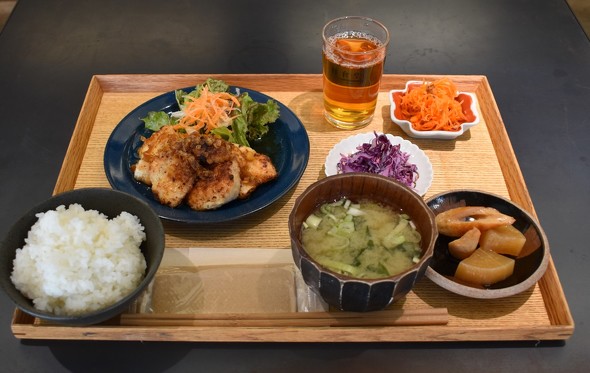 例えば、肉または魚から選べる日替わり定食(1320円)は主菜とごはんに加え、副菜3品と味噌汁がついている。それ以外にもカレーや丼ものを提供するほか、カフェメニューやアルコールも提供している。