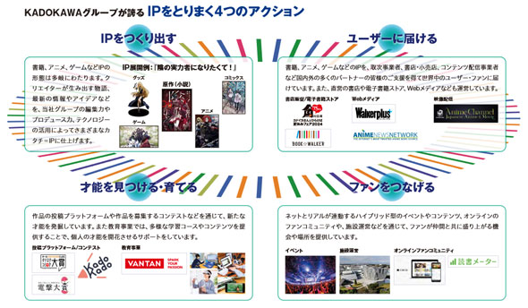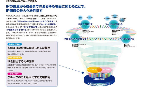 マンガはもちろん、ラノベなどの書籍、アニメ、ゲームなどさまざまなIPをつくり、売っていく複数の事業をもつKADOKAWAは「IP価値の最大化」ということを常々うたっています。これは同社の特質から分かりやすい考え方で、他の出版社にはとれない大きな戦略です。
