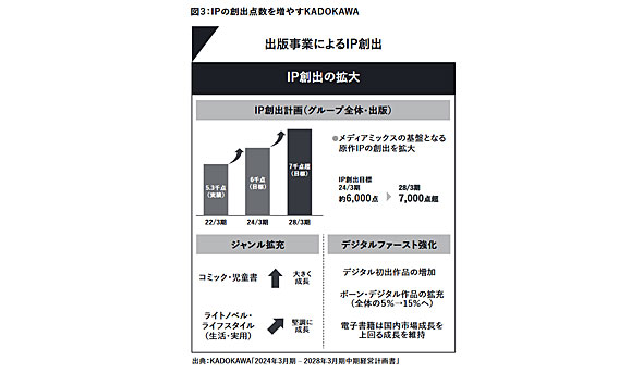 KADOKAWAは、2024年3月期〜2028年3月期で中期計画書を出しています。その中で「IP創出目標」を24/3期で約6000点であるところを、28/3期で7000点超目指していくということを書いています(参照リンク)。