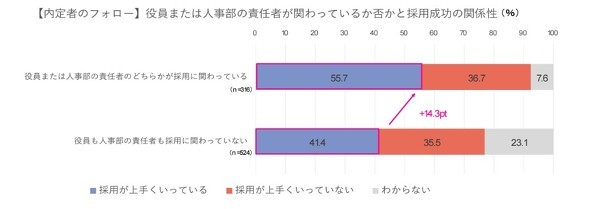 リクルートによる企業の人事担当者840人を対象とした調査(2023年3月実施)では、内定者フォローのプロセスにおいて、役員または人事責任者が関わる企業と、そうでない企業とを比べると、役員または人事責任者が関わる企業の方が「採用がうまくいっている」と回答した割合が14.3ポイント高かったのです。