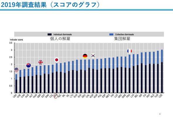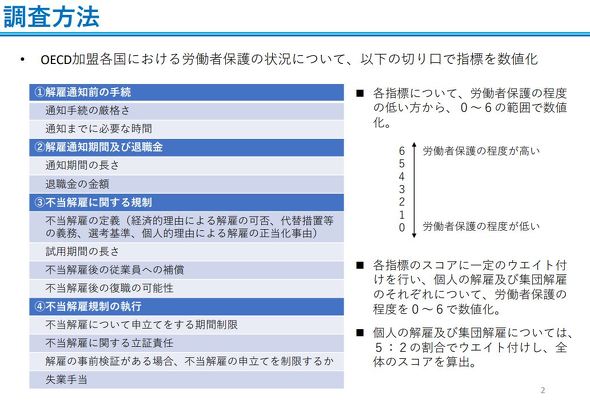 しかし、そういった一般的な認識とは裏腹に、実はわが国の解雇規制は世界的に見ると「弱い方」だ。OECD諸国で比較した場合、日本は解雇規制が弱い方から11番目。米国より厳しく、欧州諸国より弱い、という位置付けなのである。